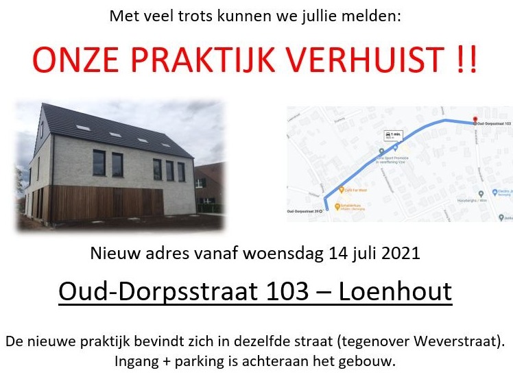 - De praktijk zal uitzonderlijk gesloten zijn van 27/7/2020 tot en met 31/7/2020. In deze periode kunnen jullie terecht in praktijk Medika, Kalmthoutsesteenweg 117 in Wuustwezel. Jullie kunnen hen bereiken op volgend telefoonnummer: 03/669 85 55.